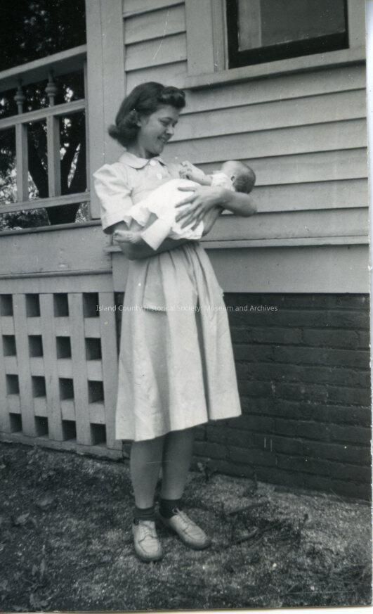 Unidentified woman holding baby Maja Elizabeth Lawson (3 months, 2 days) in a yard next to a house. July 28.
