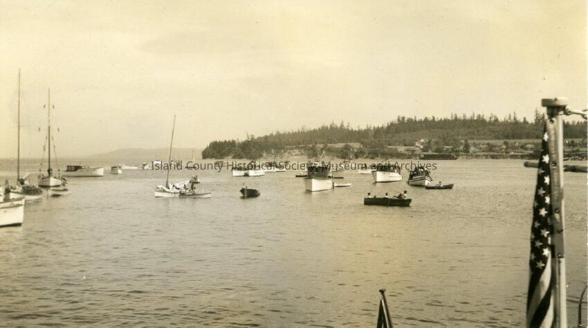 Coupeville Harbor on Water Festival Day 1940, many boats are on the harbor with an american flag in the foreground.