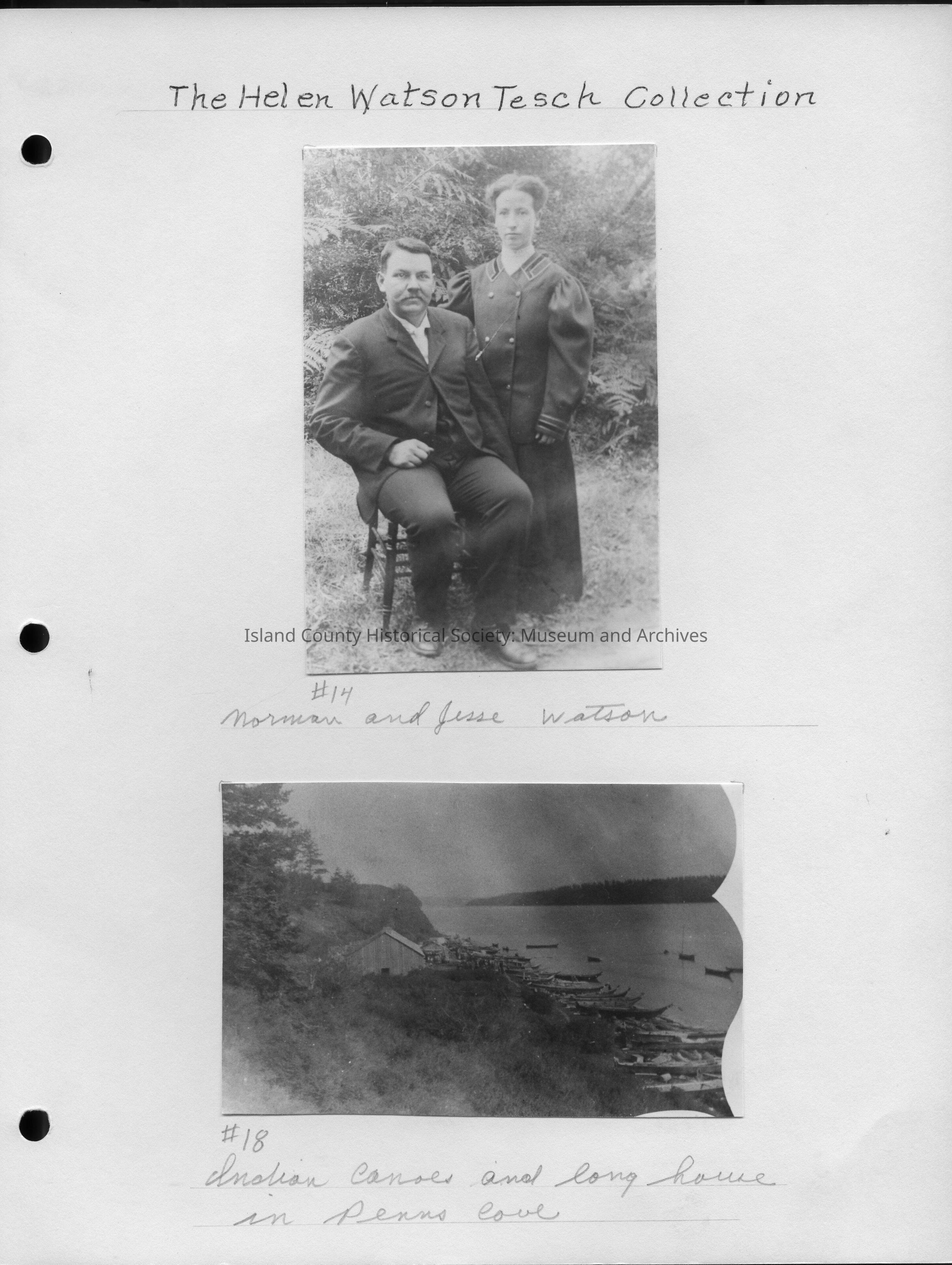 Bottom Photo - 4.5"W x 3"H - Photo of many Native American canoes on the shore in front of a long house on Penn Cove. There is a high bluff behind the longhouse. No date.