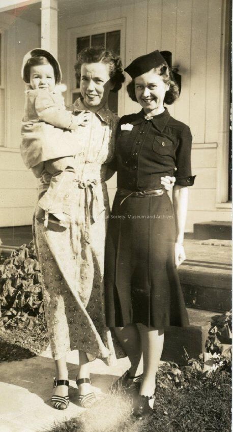 Ann and Betty Pickard holding Noelle Pickard in front of the Pickard's house in Seattle. Armistice Day 1940.