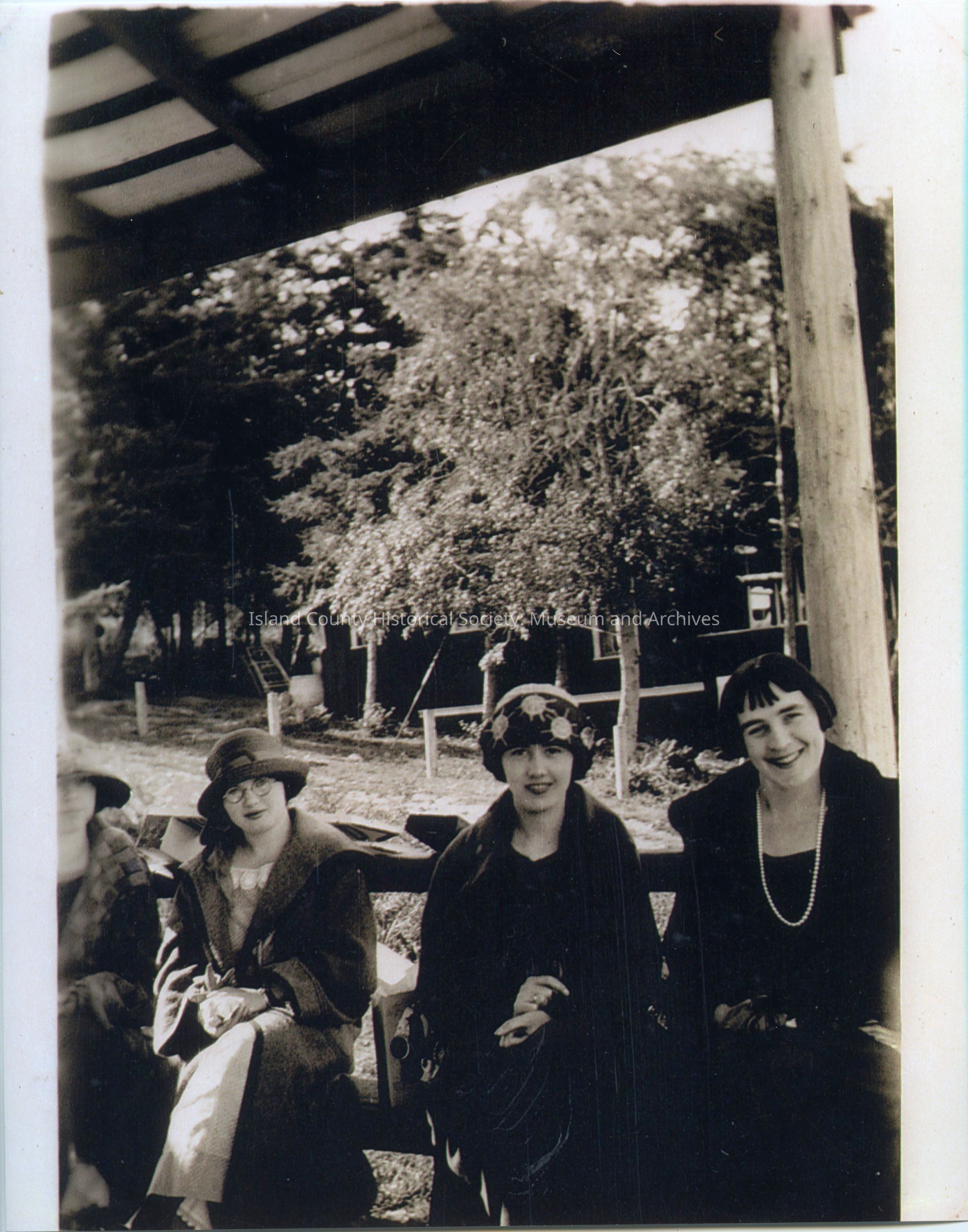 Photograph of four young women seated on a bench at Deception Pass State Park, c. 1924.