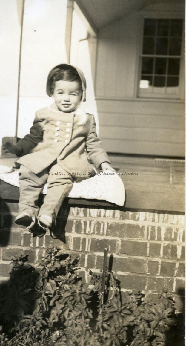Noelle Pickard sitting on the edge of the porch of the Pickard family. At the Pickard's in Seattle. Armistice Day 1940.