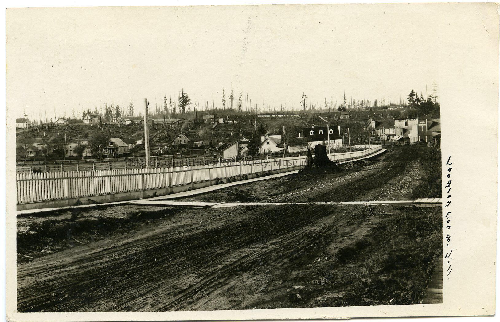 Postcard of a street in Langley. It is a dirt road with wood plank sidewalk and crosswalk. A picket fence is along the left side of the road. Telephone poles. Hotel Langley is in the background on the right. A few trees here and there. Written vertically on the right: Langley from the hill. Postmarked Jan 22, 1909. Addressed to Mrs. Annie Engle, Seattle.