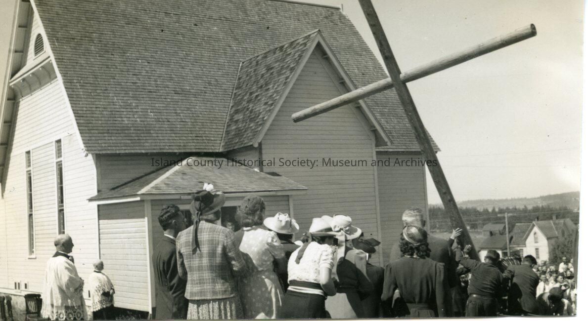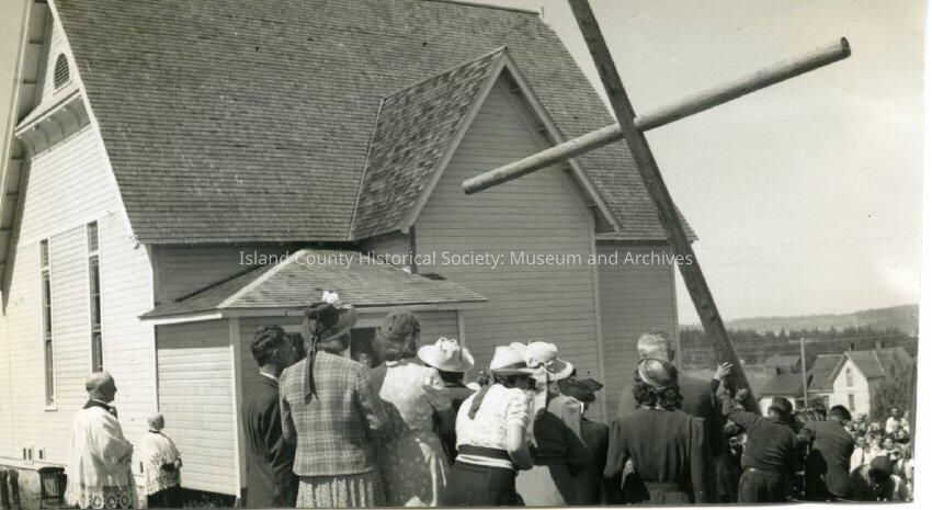 Raising of a wooden cross beside the Catholic church to commemorate the raising of another cross nearby by Indigenous Peoples and Priests 100 years ago.