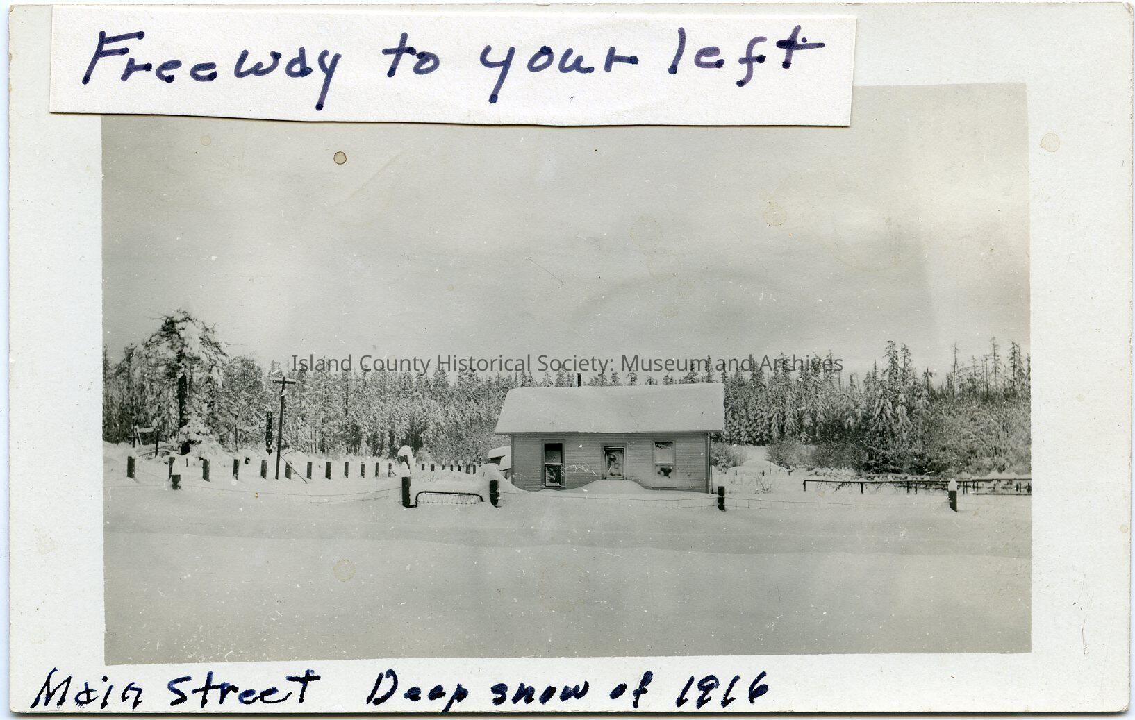Photo of a small house covered in snow. Trees are in the background, fencing in front and either side, telephone pole. Taped to the top: Freeway to your left. Taped to the bottom: Main Street deep snow of 1916