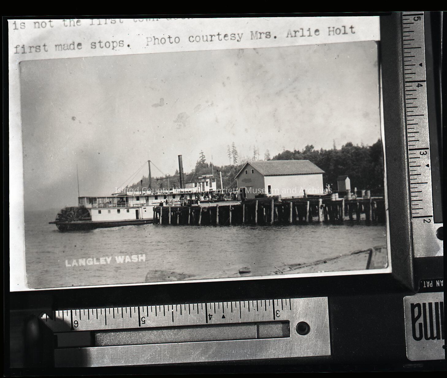 Negative of a wharf with a building on it. A steamer paddlewheel ferry is tied up at the dock. Trees on the hill. Taken from the water. Caption: Langley Wash.