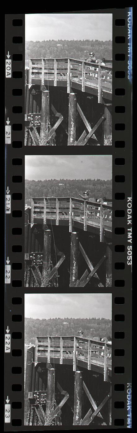 Negative strip of three images of a boy with a baseball cap fishing off a dock - possibly Langley dock/wharf.