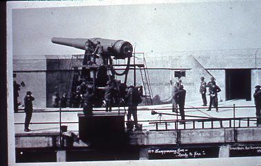 Photograph of a large mounted gun at a fort.