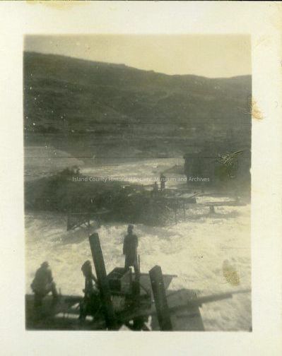 Photograph of individuals fishing at Celilo Falls, likely c. 1930s-1940s. Possibly Indigenous salmon fishermen.Photograph Details