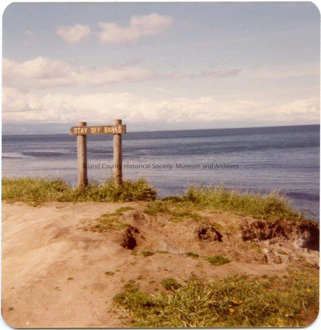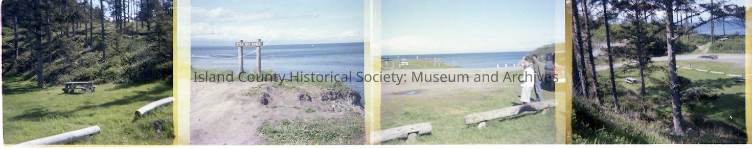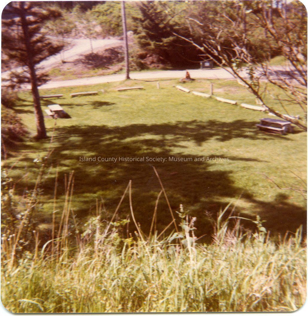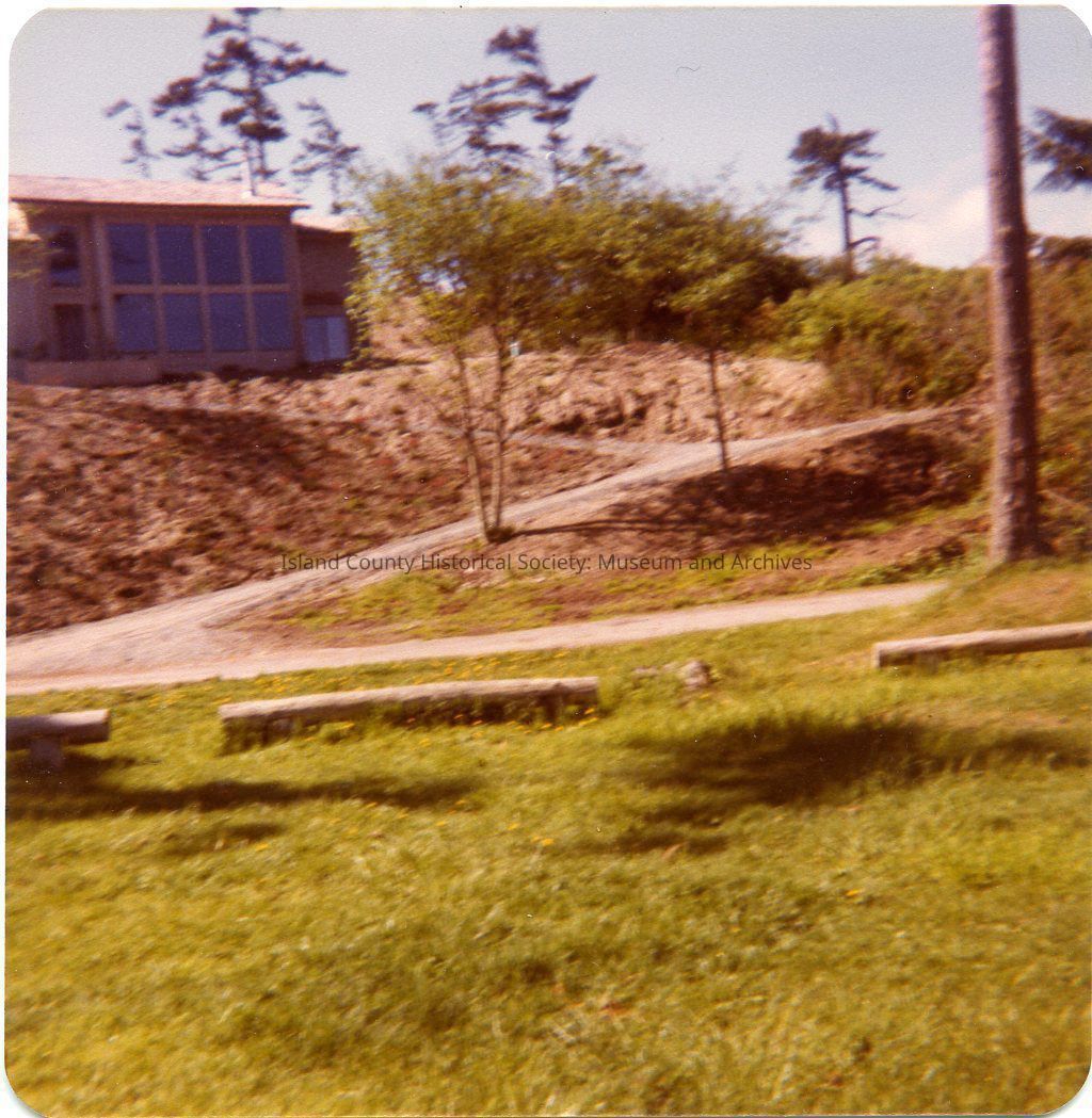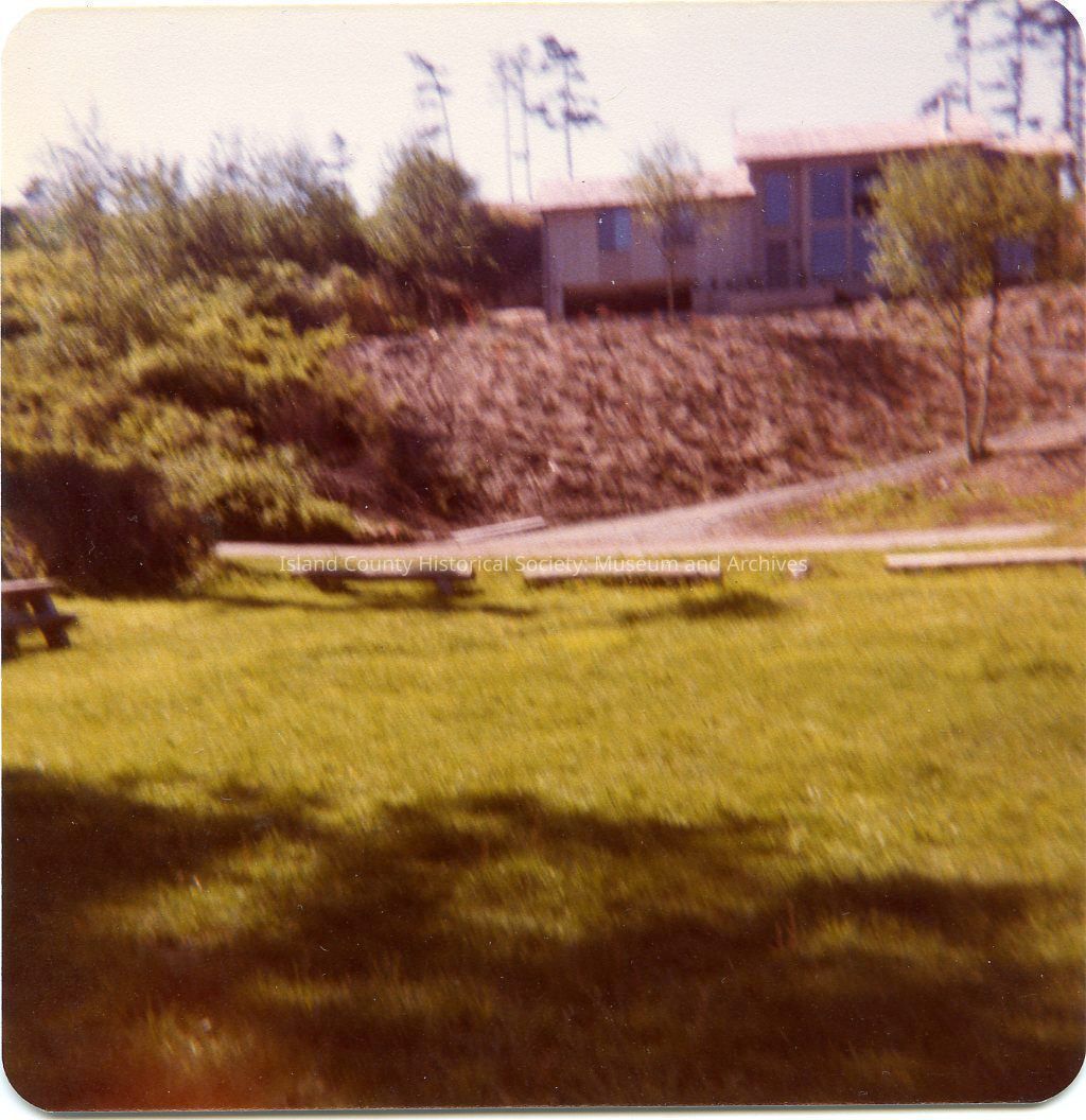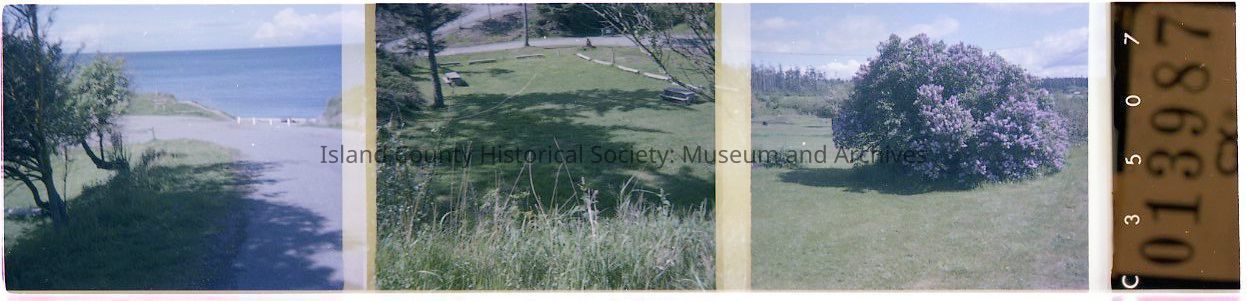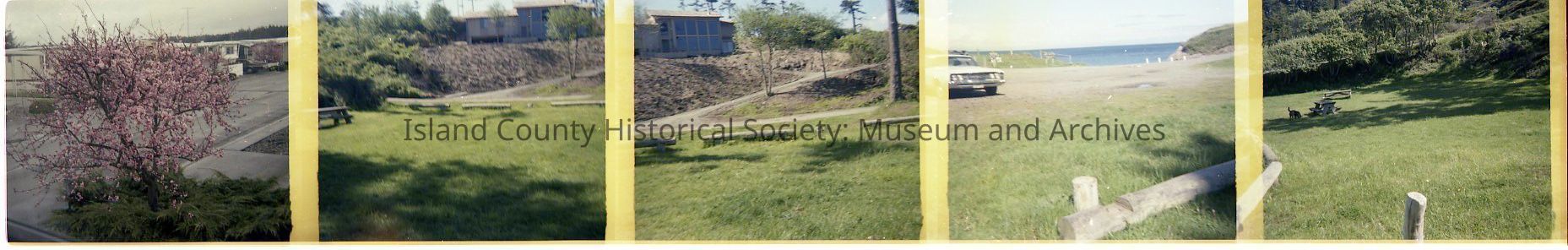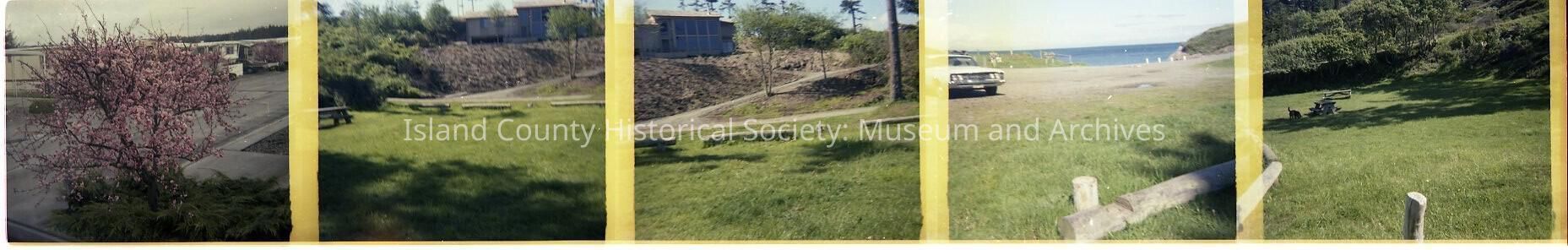 Negative strip of five images of a grassy area, trees, building and probably a driveway. This strip also includes the negative 2019.034.123a. The photo goes with frame 3: a grassy area with dirt roads, and logs placed to protect grassy area/use for parking area and a building with lots of glass windows.