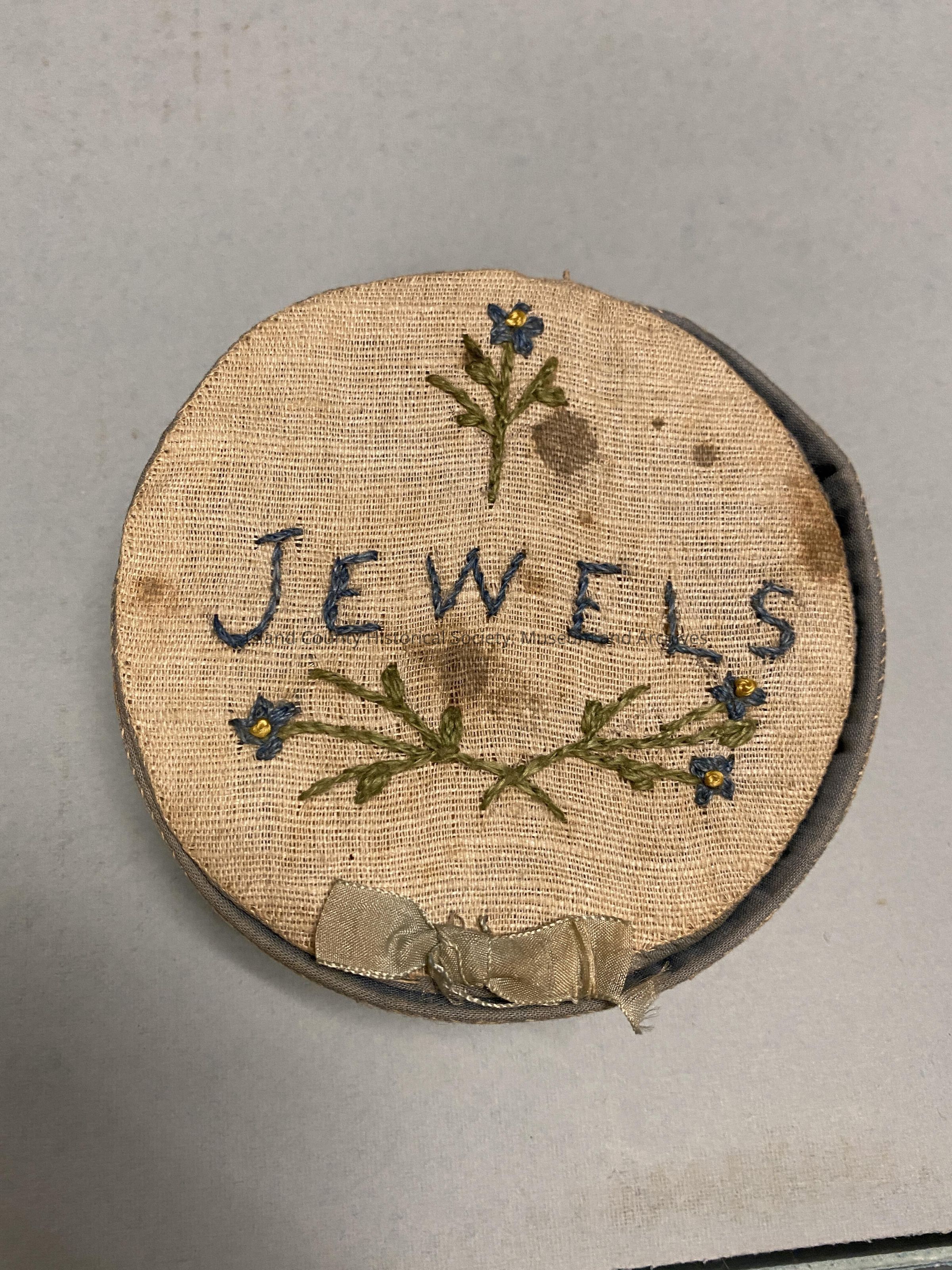 Home-made jewelry box Linen Jewelry box with embroidery. Stained and discolored