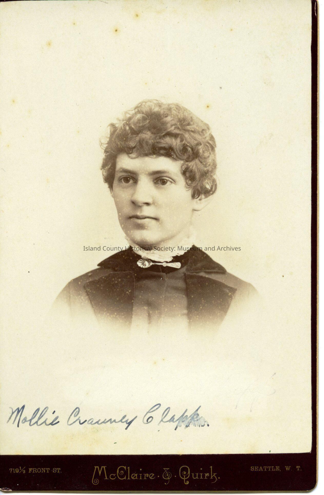 Portrait of Molly Cranney (Clapp) she has a short curly hairstyle and is wearing an overcoat clasped together with a miniture spoon clasp.