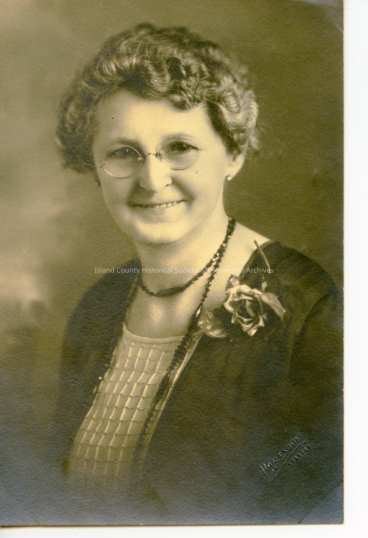 Portrait of Alinda "Linnie" T. Cranney Empie wearing a cardigan and a rose brooch.