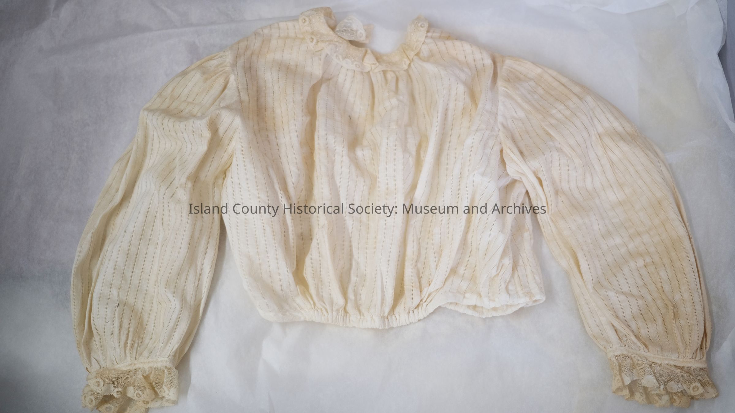 White cotton blouse, lace ruffle around neck and sleeves, Juniper blouse