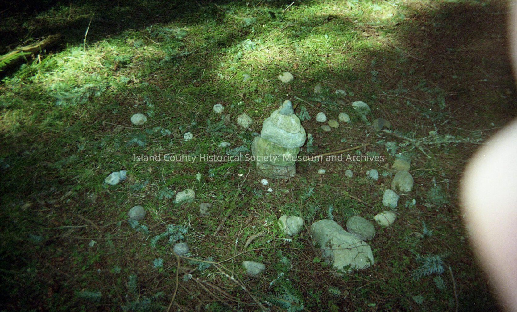 Photo of a "goddess" for the garden (outside Autio house?). The family decided that there should be a goddess. Set up in 2002. She is quite wide, made of stone (?) and surrounded by smaller stones in a sort of fairy ring amongst the grass.