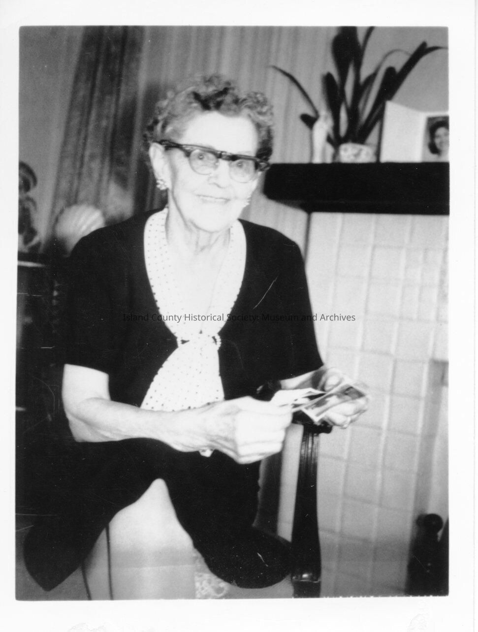 Seina (Cranney) Baker seated next to a fireplace. She is the granddaughter of Capt. Coupe her mother was Sarah Coupe Cranney.