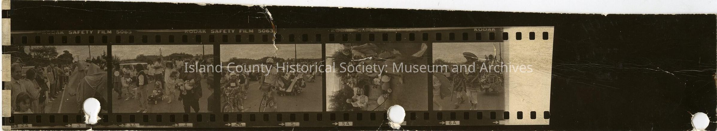 Contact sheet of a negative strip of five images of a parade, people on bicycles, and in costumes. Maxwelton.