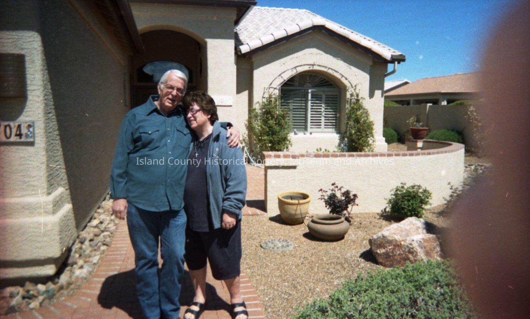 Negative identifiable as "2A". Karen Riston's friends in Arizona standing outside a white house with pebbled garden.