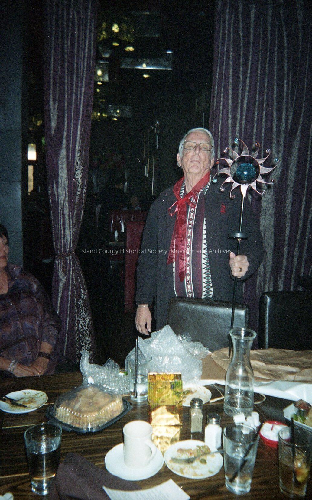 Negative identifiable as "3A". Older man with white hair stands before a table laden with food holding a staff with a flaming sun top. Curtains partially closed behind him. Lady sitting to left of frame. Darkened room.