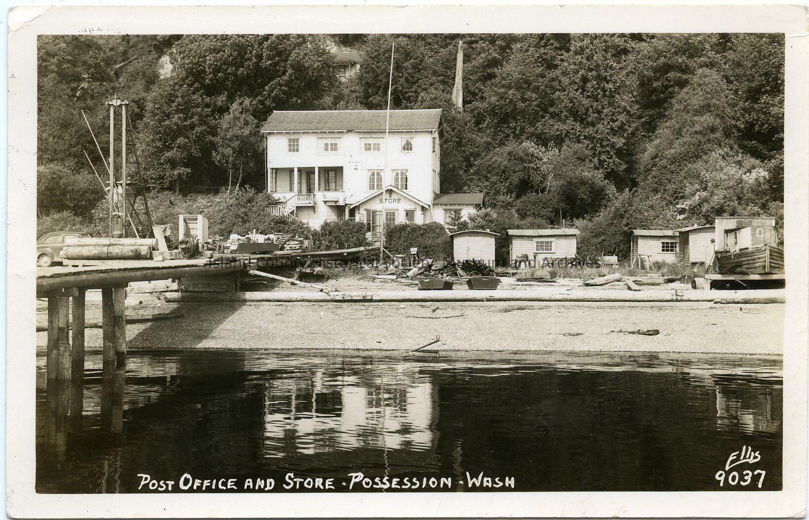 Postcard of a three-story building on a shore. Small buildings in front of it as well as a wharf/pier. A sign over a building: Store. Flag pole on the beach. On the wharf is a pulley system with some logs and a car on the shore behind it. On the right are three row boats. Driftwood and other debris scattered about the shore. Probably a tug boat or small fishing boat is up on a wood platform on the right. Caption: Post Office and Store, Possession - Wash.