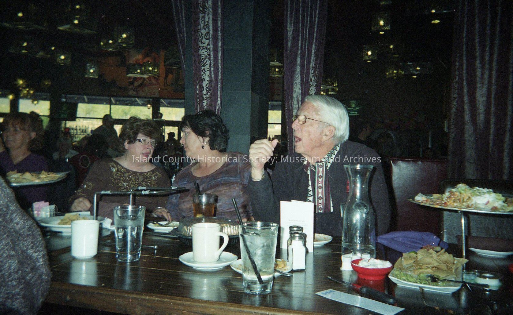 Negative "5A". Old man with white hair and two older ladies with dark hair seated at a restaurant table laden with food. They appear to be in conversation. Curtains and windows behind them.