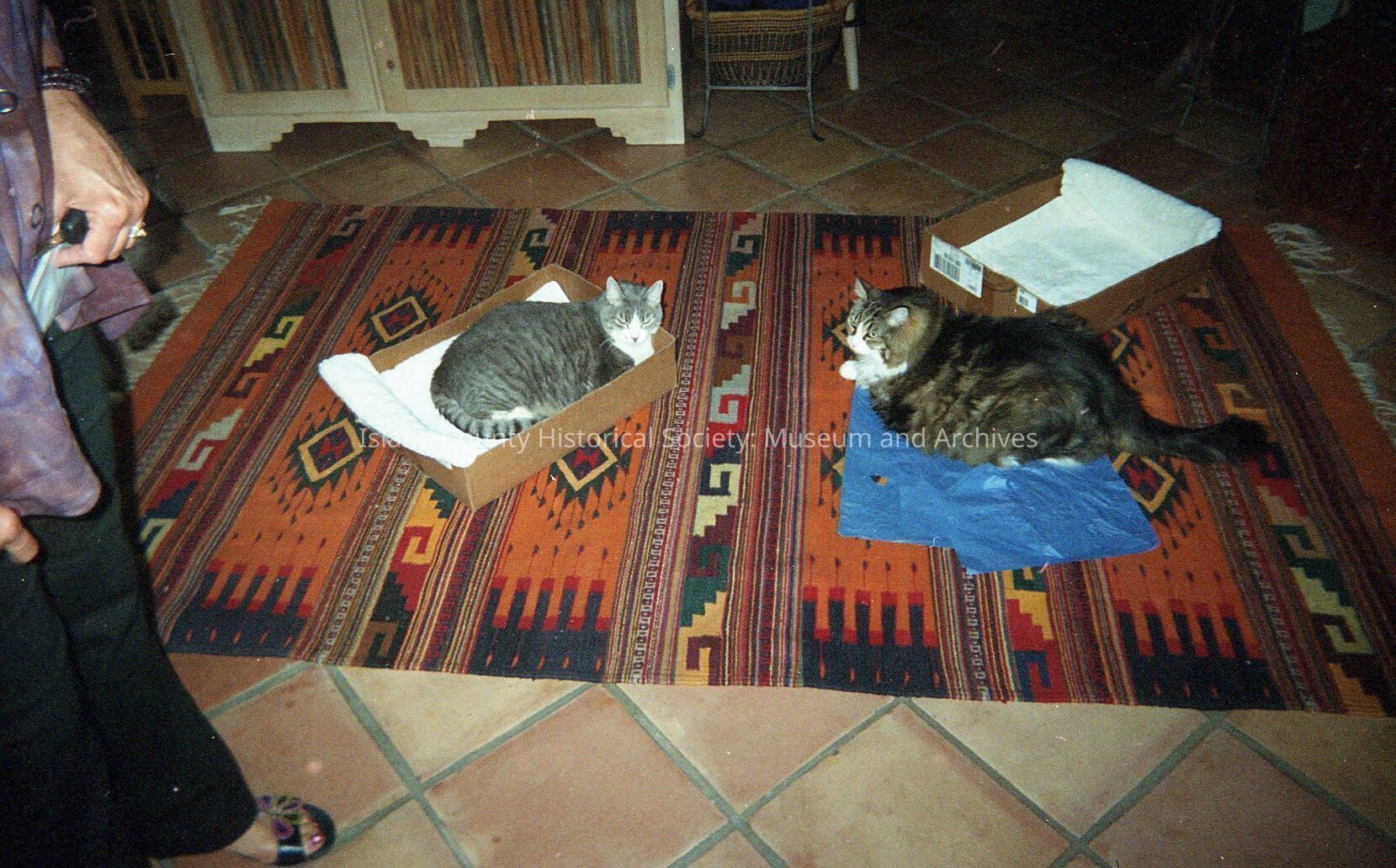 Negative "6A". Terracotta-like tiled floor with multicoloured geometrically patterned rug laid upon it. Two cats (tabbies?) resting on the rug, one in a cloth-filled box, the other on blue cloth. Partial body of woman left side foreground.