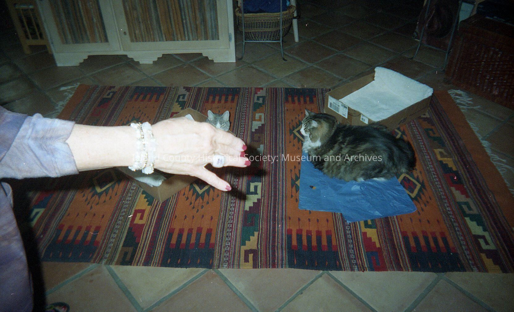 Negatidve "7A". Terracotta-like tiled floor with multicoloured geometrically patterned rug on it. Two cats (tabbies?) sitting on the rug, one on blue cloth and the other in a box lined with white padding. Woman's hand in foreground extending from left side of frame.