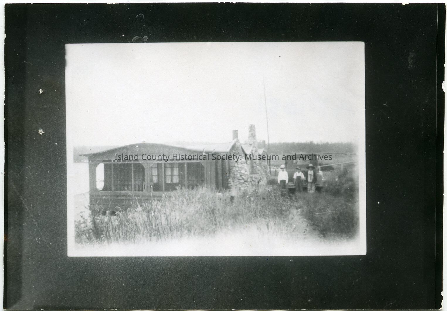 Photo of a small house with three stone fireplace chimneys on one side. A truck is in the drive or road with three young people in front. Porch almost fully enclosed. Penn Cove in distance.