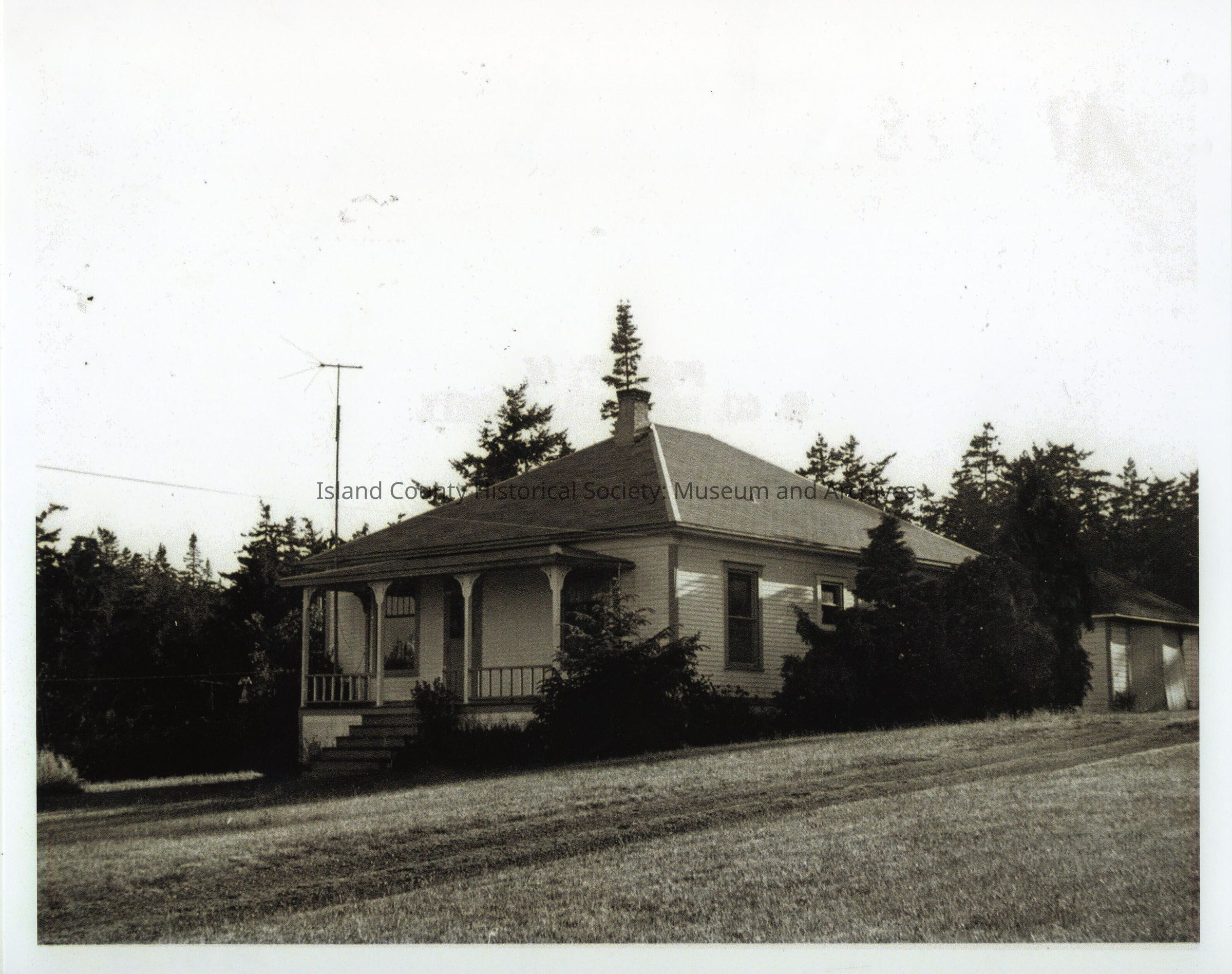 Photo of a single story house or building, single almost central peaked roof, central chimney. Front porch. Trees around it. Two windows in the front, at least two on the side. Stairs leading up front porch. Telephone pole on the left side of the house. Outbuilding in the back on the right.