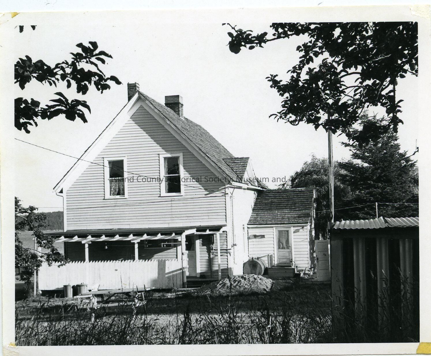 Photo of a two-story house with porch, two front windows, two chimneys near the peak of the roof, addition with door on the right, small dormer above the addition. Outbuilding in the front right. Picket fence along the front porch. Trash bins in front, picnic table, propane tank beside stairs to door of the addition. Electricity meter on the front corner. Telephone wires.