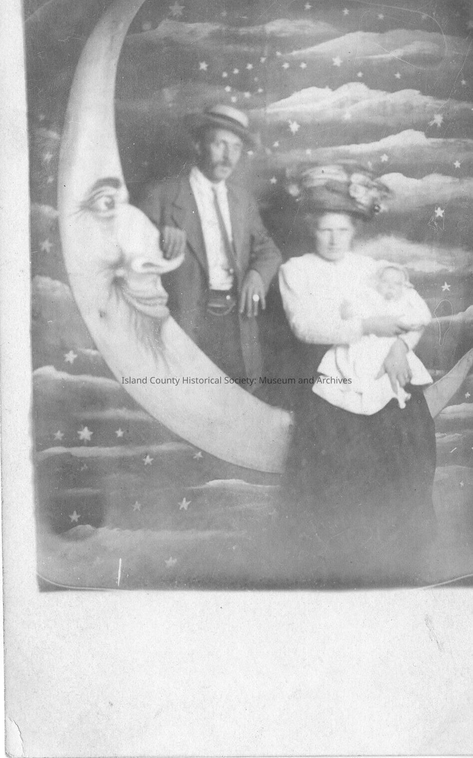This picture was taken in Leeds South Dakota circa 1911. This is Eli Autio and Mary. She is holding their son Walter. Studio photograph, posing with a half-moon face in front of a starry night sky. On back says that it is a postcard, and areas to place the stamp, correspondence and name and address.Lexicon
