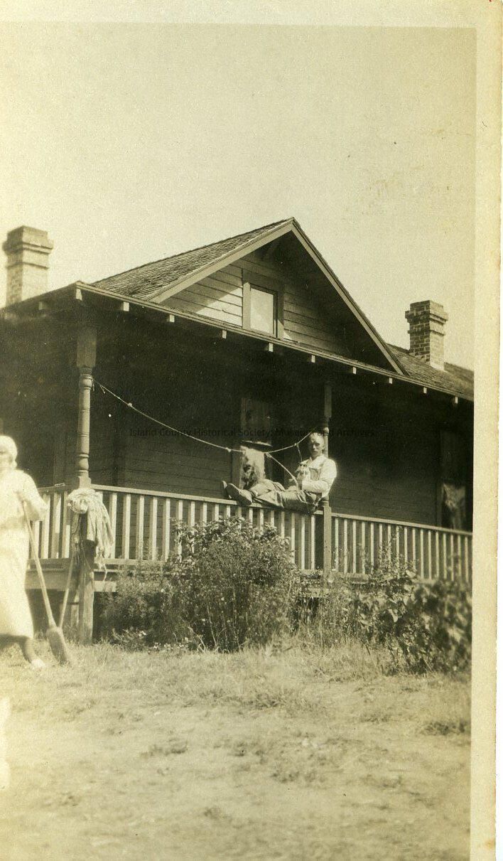 Eli on the railing with aunty Mary with a broom on the far left. This is the Autio house in Greenbank seen in about 1920. Eli is buried in Sunnyside Cemetery.