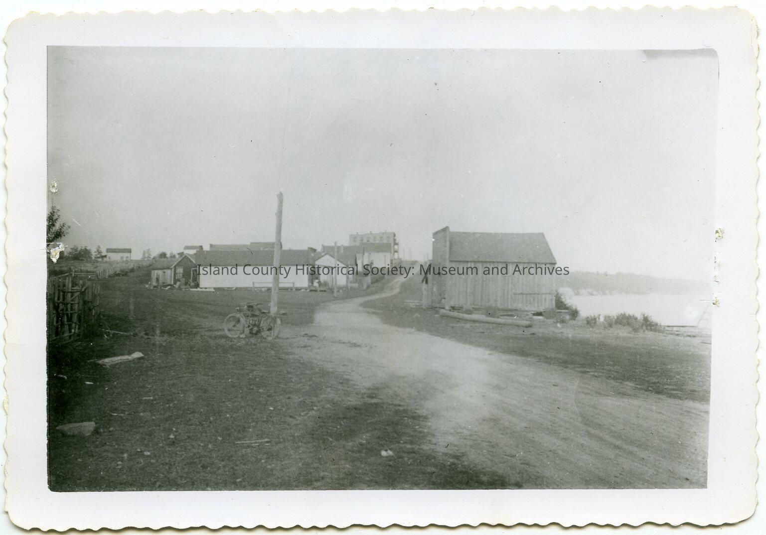 Photo of a dirt road in San de Fuca with some buildings and telephone pole along the coast. A bicycle is leaning against the telephone pole. The Benson Hotel is at the top of the hill on the left. Penn Cove is on the right. Written on the back: The bend in the road at San de Fuca. Before the new highway. Chris Fisher store on right.