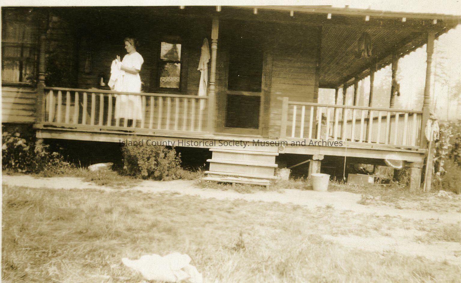 Aunty Mary is on the porch doing her daily routine. You can see ethe post and block foundation of the house. The window seen would be where the kitchen sink would be on the inside. A wood stove was next to it and then a pantry. The window on the left would be a bedroom.