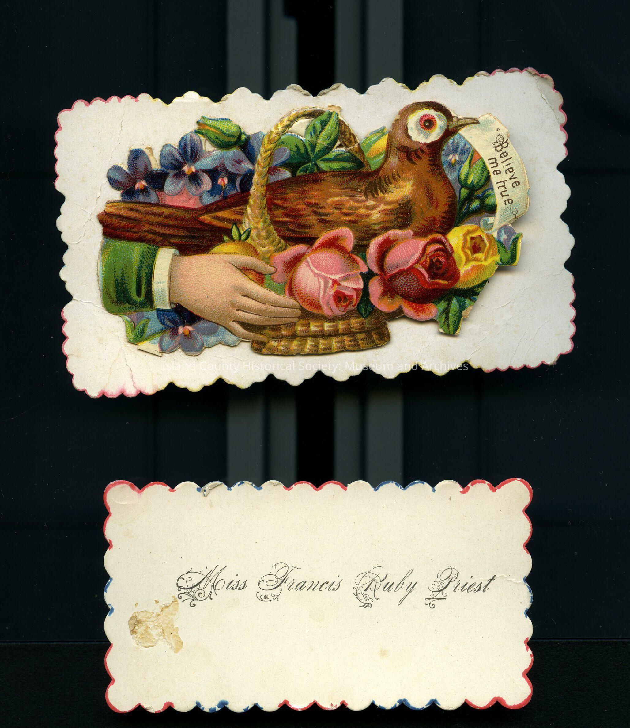 Two calling cards - A - with Doves surrounded by flowers made of paper, inside "Vera Hancock". B "Francis Ruby Priest"