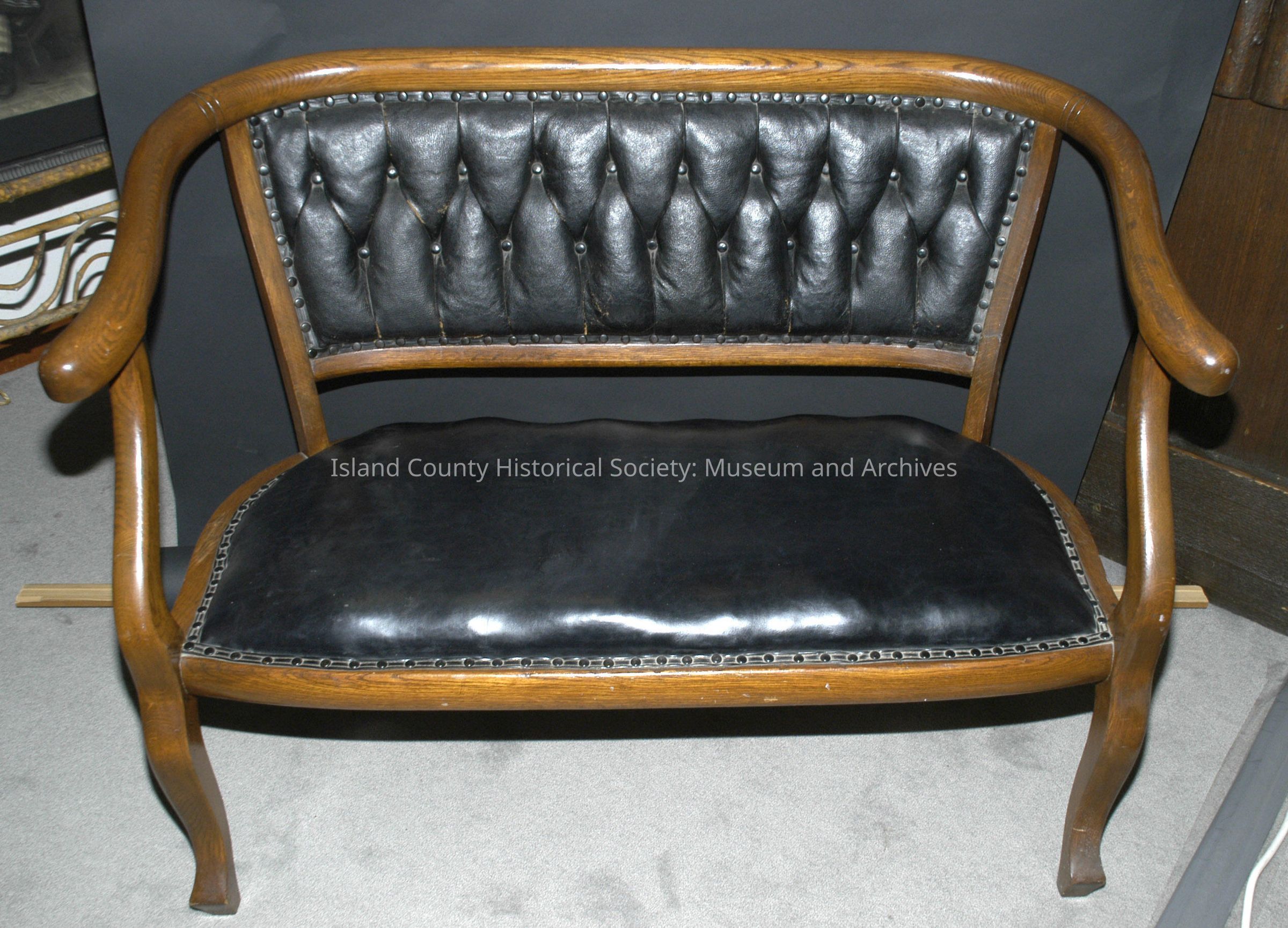 Settee, leather. Oak Frame with black leather upholstery, tuffed on the back. 3' 8" x 2'3" x 2'2".