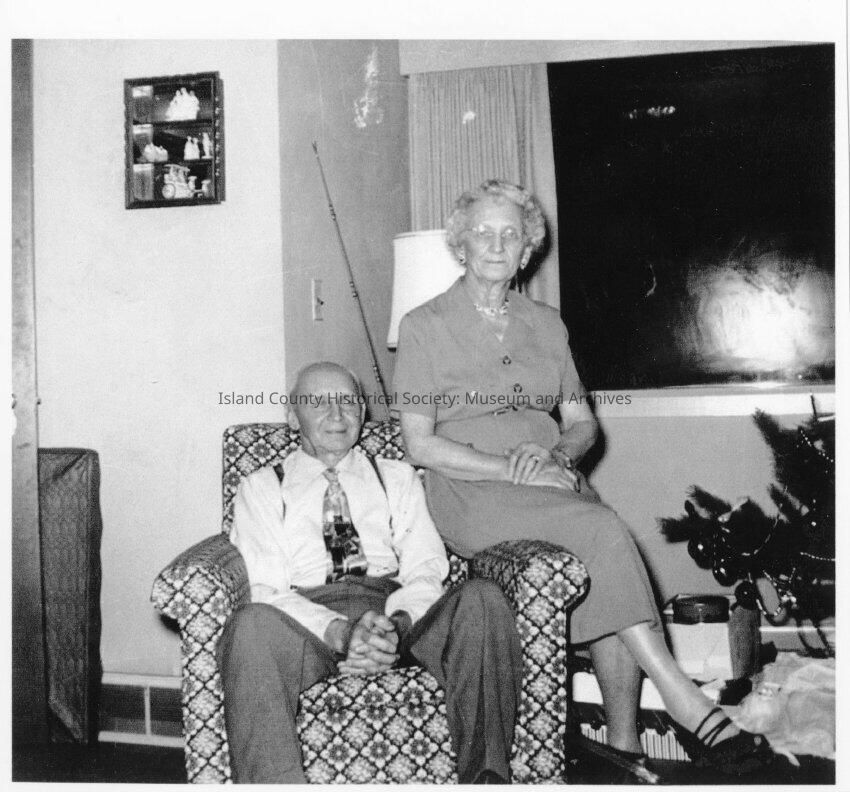 Maude (Calhoun) Atherton and Spurgeon Calhoun 1957. Maude is sitting on the arm of a chair that Spurgeon is sitting in. A Christmas tree and presents are on the right beside them. From Julie Lamoureaux's genealogy notebook.