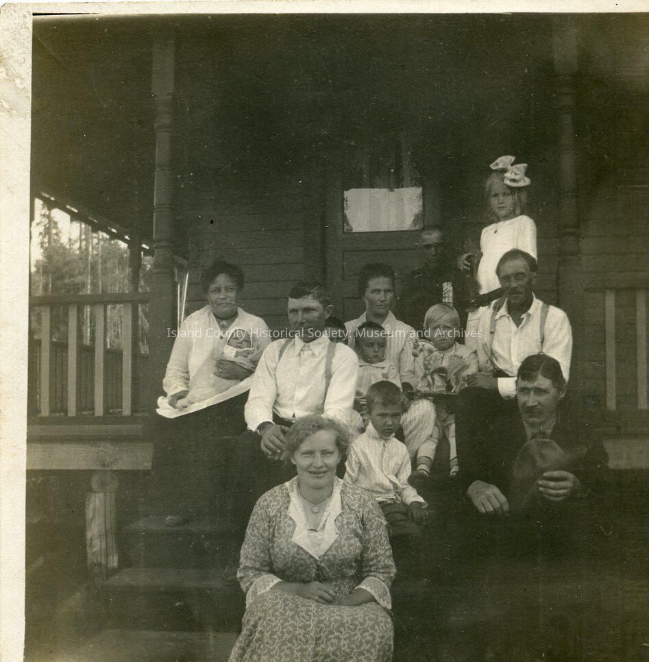 Aunt Mary Autio is in the front. Elizabeth Anderson has a great big bow and is standing in the back. The porch is on the north side of the house- there was a front door there. Mrs. Leetola in the center back holding a child. Mr. Leetola has the hat. There are three of their children around them (Frank, Albert were two of the names). Mr. Christenson is sitting with the suspenders. Walter Autio has the blond hair. Mrs. Christenson is on the far left with Grace in her arms.