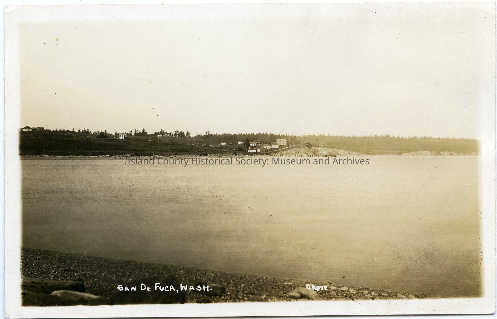 Postcard of San de Fuca from across Penn Cove, looking north. Pier. Various buildings, barns, houses, Benson hotel on the hill on the right. Caption: San de Fuca Wash.