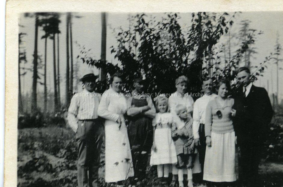 Walter is the little boy, arms around him is aunty Mary, to the left is Elizabeth Anderson. Then Eli Autio. Fina Sandstrom is present there. Aunty Fannie Berg on the right. (ID has been done by Karen Riston and sister Karla Anderson). Posing for the camera in front of a prune tree. Grassland and several very tall thin trees in background. 1922. Bill Reivinin and his wife Saimi (on left?).