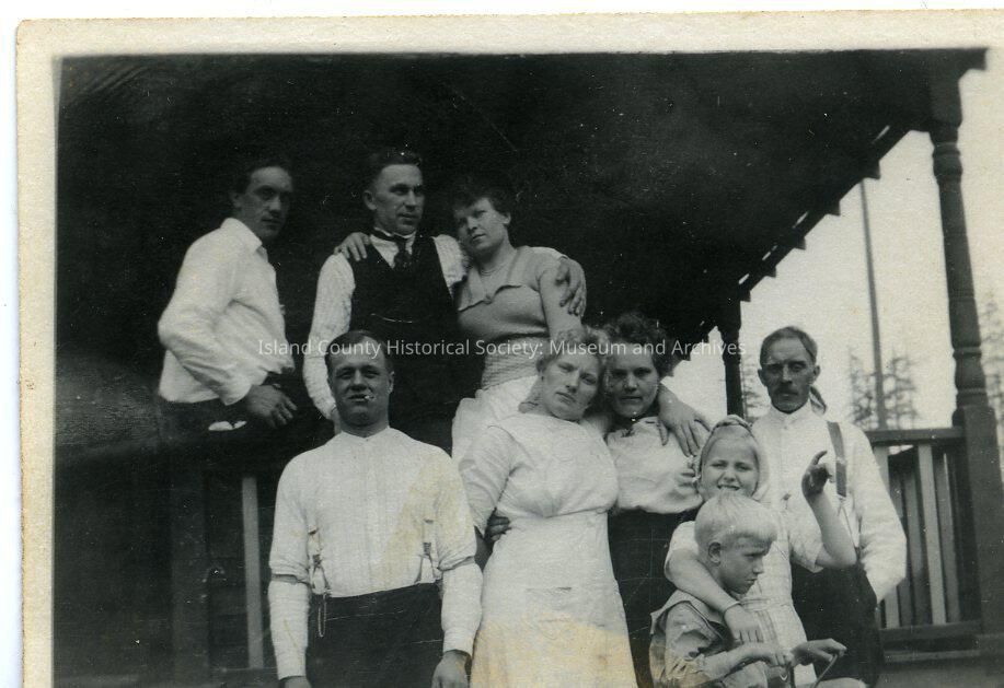 Two ladies embracing- the one in the white is Mary Autio with Fina Sandstrom with black skirt. Elizabeth Anderson is the younger with Walter Autio with her. Eli Autio is on the right edge. Aunty Fannie is in the back with Bill Reivinen. 1920.