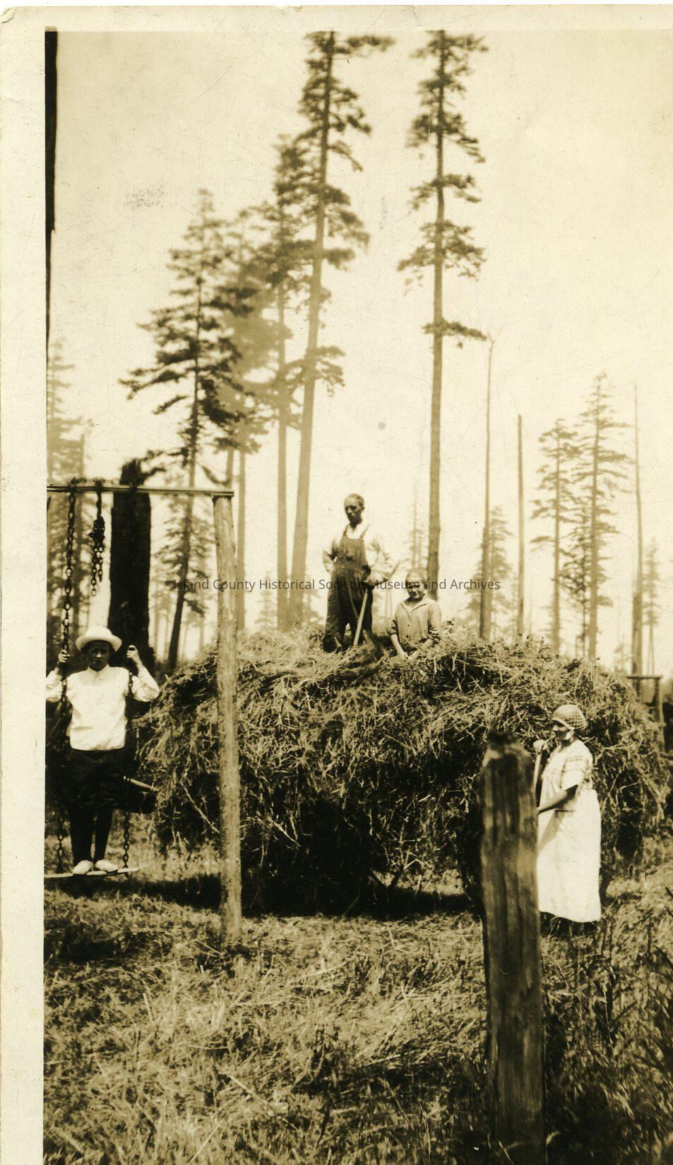 Walter Autio is on his swing. Eli Autio is on top of the hay with a young girl. Mary Autio is in the white dress down below. In the process of making hay. 1923