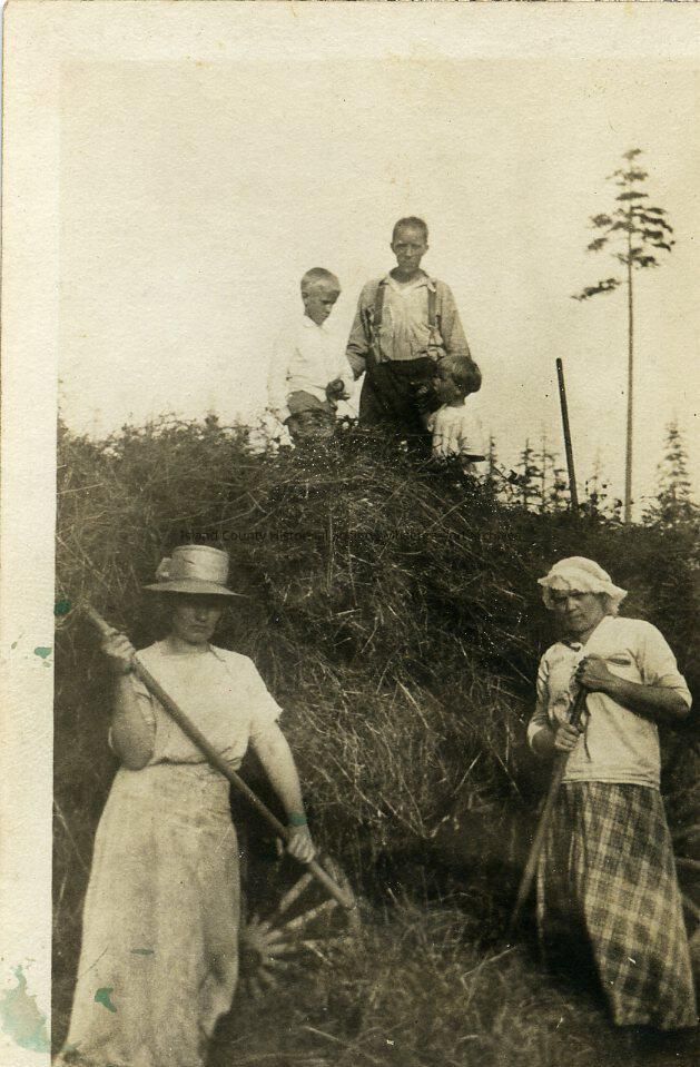 Walter Autio is on the hay with another young boy. Mary Autio is in the white dress and Grandma Fina Sandstrom in the plaid. 1921.