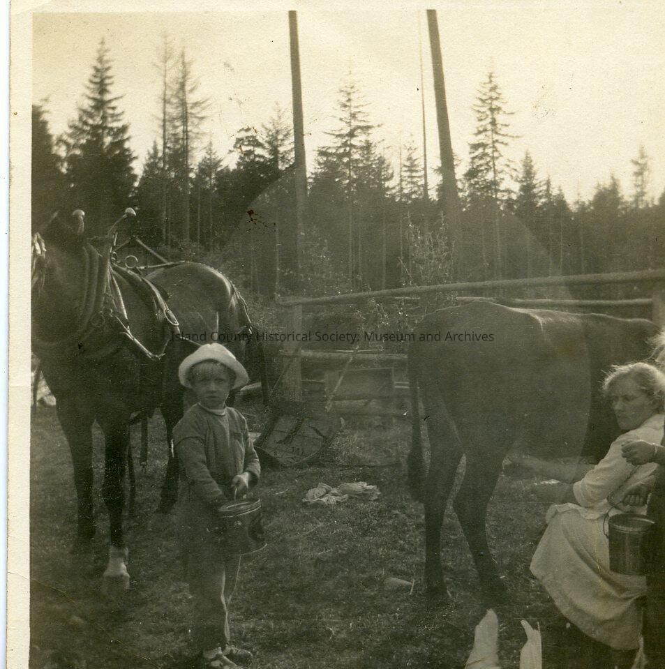 Aunt Mary Autio and Walter Autio with two horses. 1916, Greenbank.