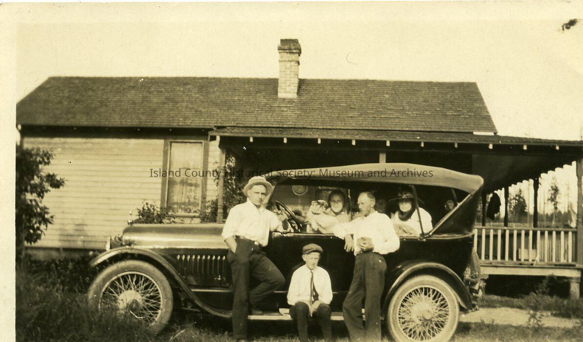 Walter Autio is sitting on the runningboard of the car (maroon red Studebaker 1924) surrounded by family. Fred Stark is on the left, and Eli is leaning to the right. Fina is on the right of Eli. Mary is behind the wheel. The bedroom is the portion of the house that is visible.