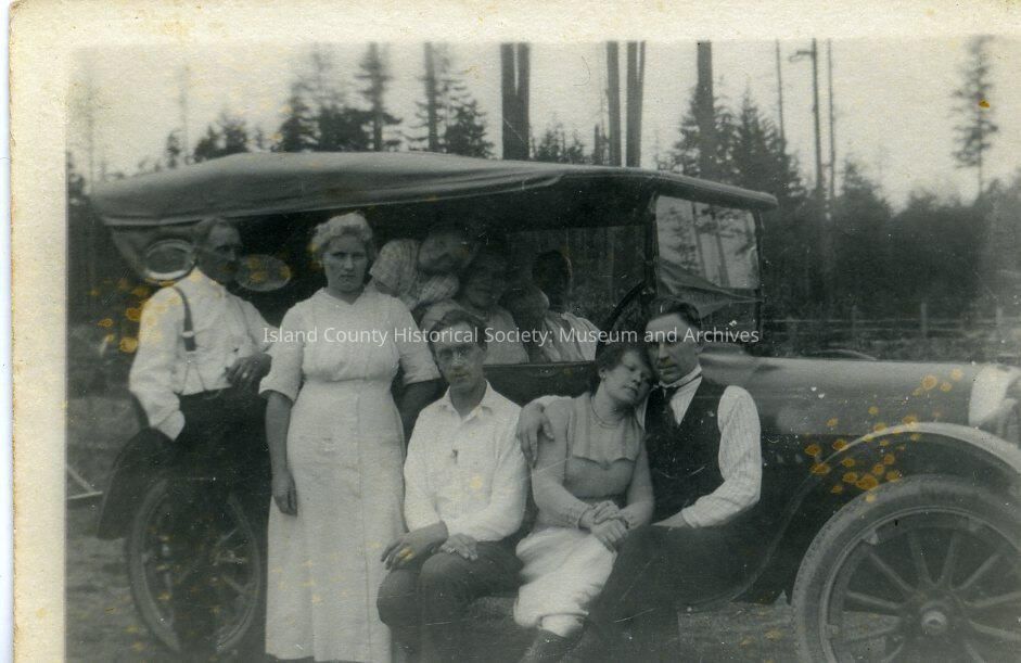 Fannie Berg is sitting on the runningboard with Bill R. Eli is to the left. Mary Autio is in the white in front. Elizabeth Anderson is bending over Fina Sandstrom in the back. Next to Fina is Walter Autio. 1920. Oakland auto.