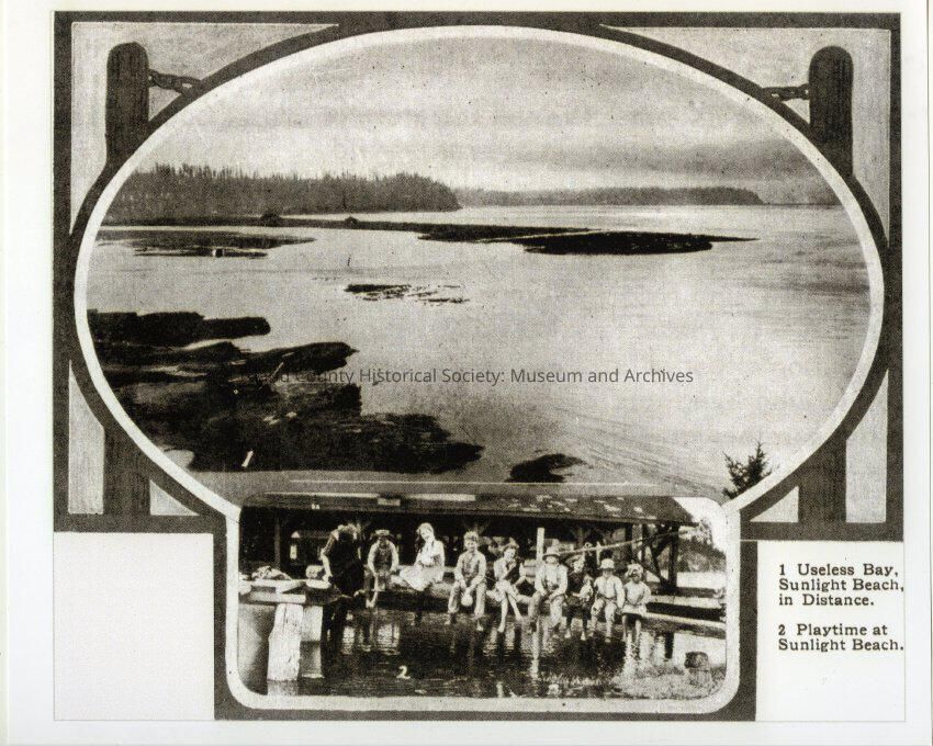 Photo of two other photos, one is oval on the top, the other rectangular. The top is of the bay and beach, driftwoood, trees. The lower picture has children sitting on a dock at the beach. Caption to the side: