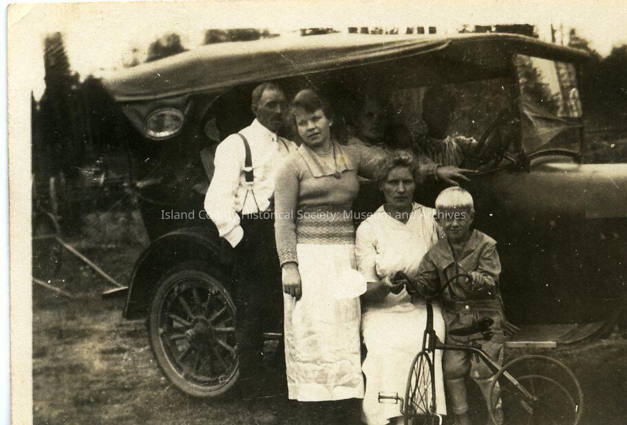 Eli Autio, Fannie Berg, Mary Autio, Walter Autio. Tricycle. People in the car are unknown. Oakland auto 1920.