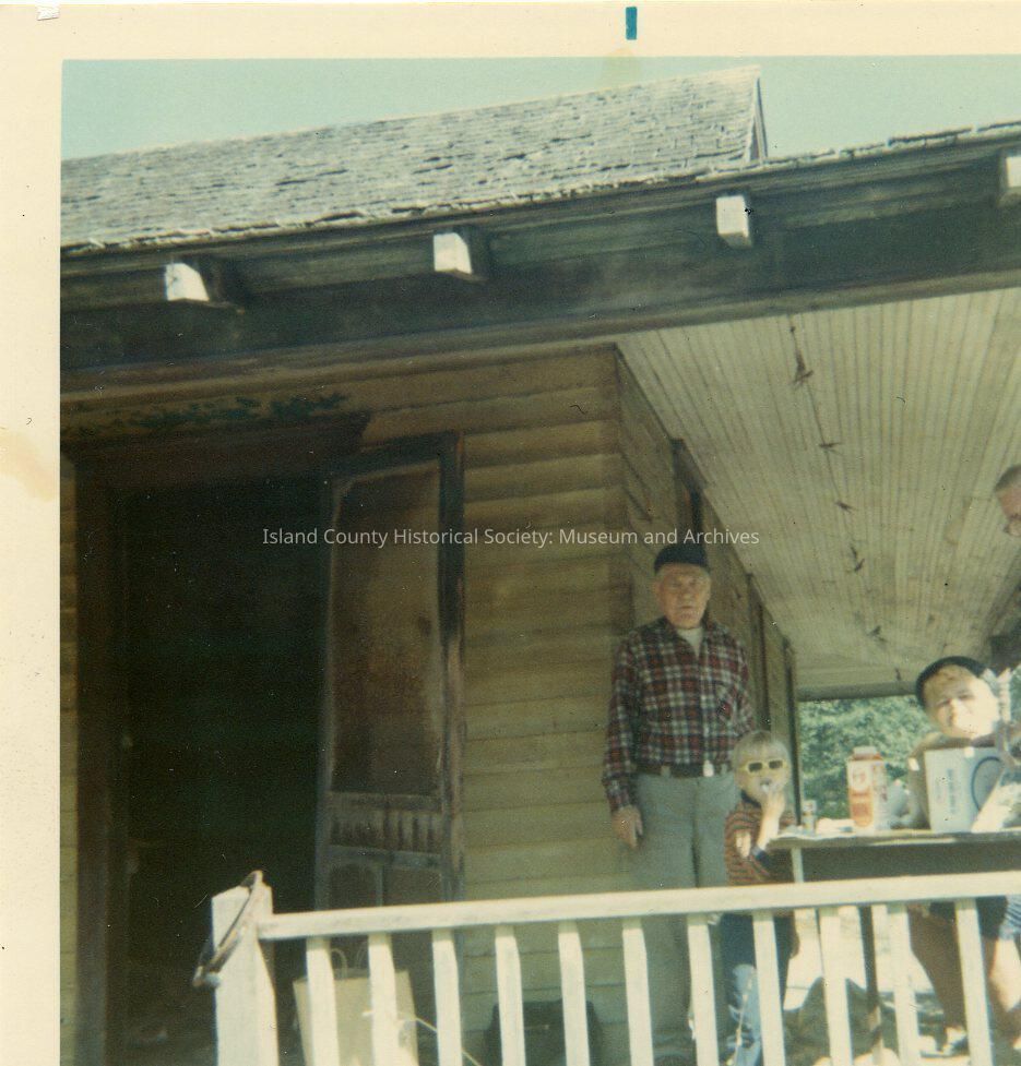 Colour photo. Karen Riston suggested that this photo is after the the article in the Everett Herald invited folks to raid the house. Otto Heino is standing, Raini Riston (Karen's daughter) is the small child and Hilma Devine is on the right. (Back of photo dates this as 1968, which would be before the Everett Herald article was published- so was this prior to the raid or after?). All on porch of Autio house, the women sitting at a table with food laid out. Porch door on the left (their right) is open.Lexicon