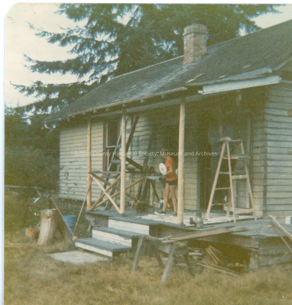 Raini is in doorway and Carl V Anderson (Karen's father) is seen on the ladder. Karen Riston would cook the concrete in front of the house as they were working to fix up the place. Fall 1974.